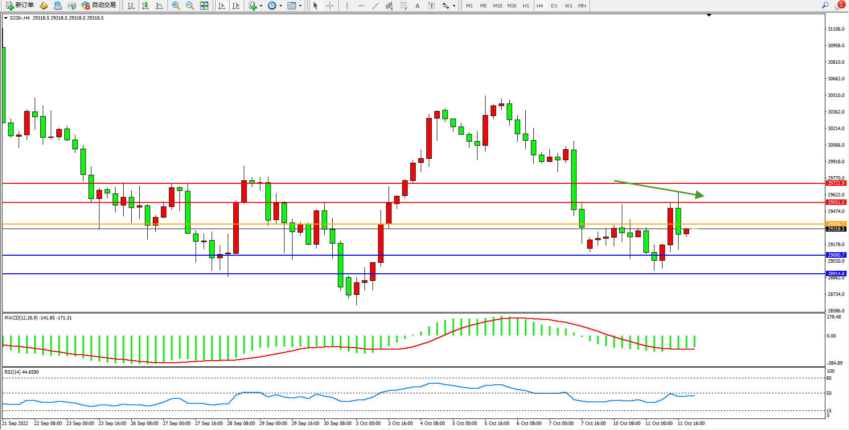 道琼斯指数DJ30——4小时K线图显示: