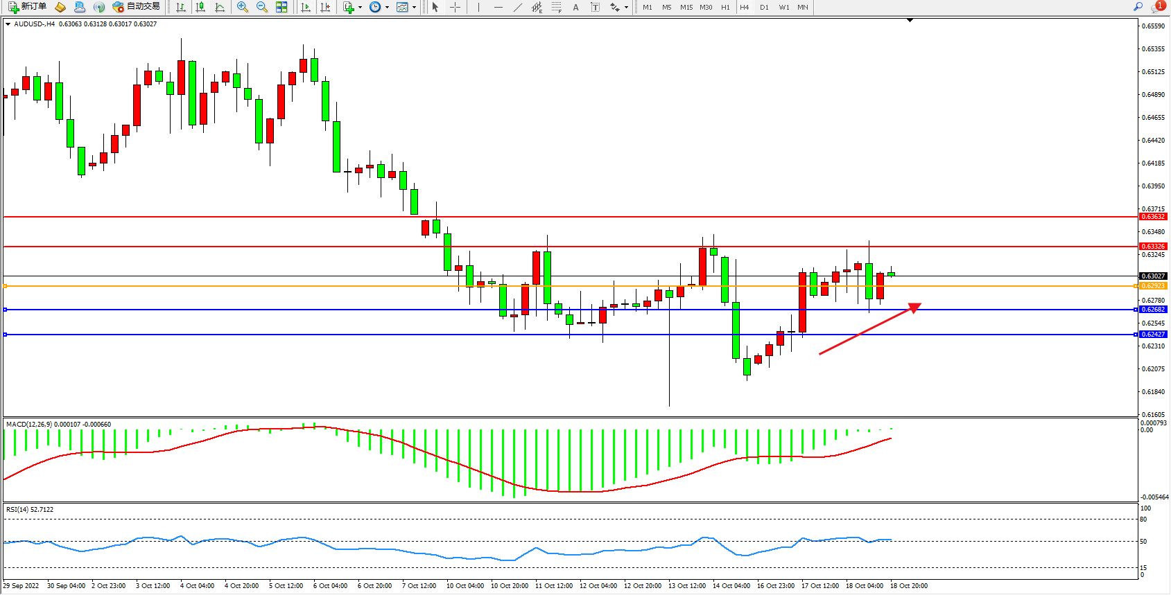 交易策略:0.62923上方看涨,目标0.63326、0.63632