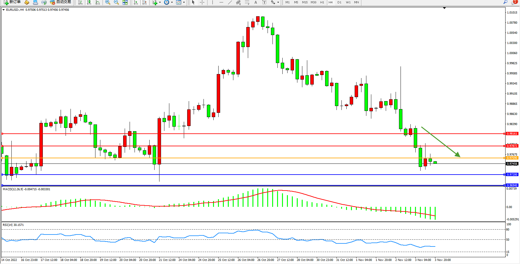 交易策略:0.97590下方看跌,目标0.97200、0.96940