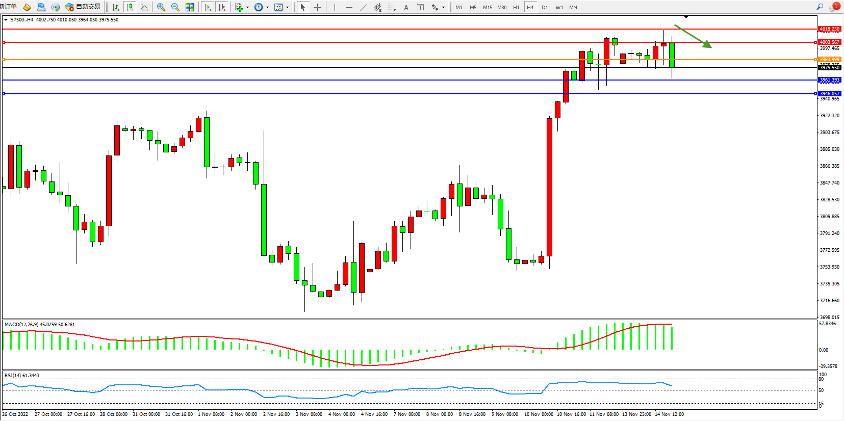 标普500指数11月14日(周一)收盘下跌34.09点,跌幅0.85%,报3958.84点;美国经济固然存在衰退的风险,但全球其他主要经济体尤其是欧洲国家,很可能比其更早陷入衰退泥潭之中,这些央行的货币紧缩政策转向,也料将来得更早。因此美元将保持相对强势货币地位。