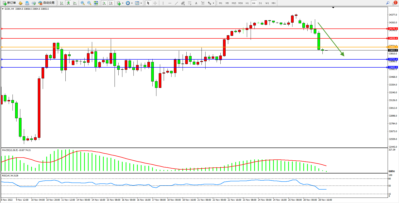 道琼斯指数DJ30——4小时K线图显示: