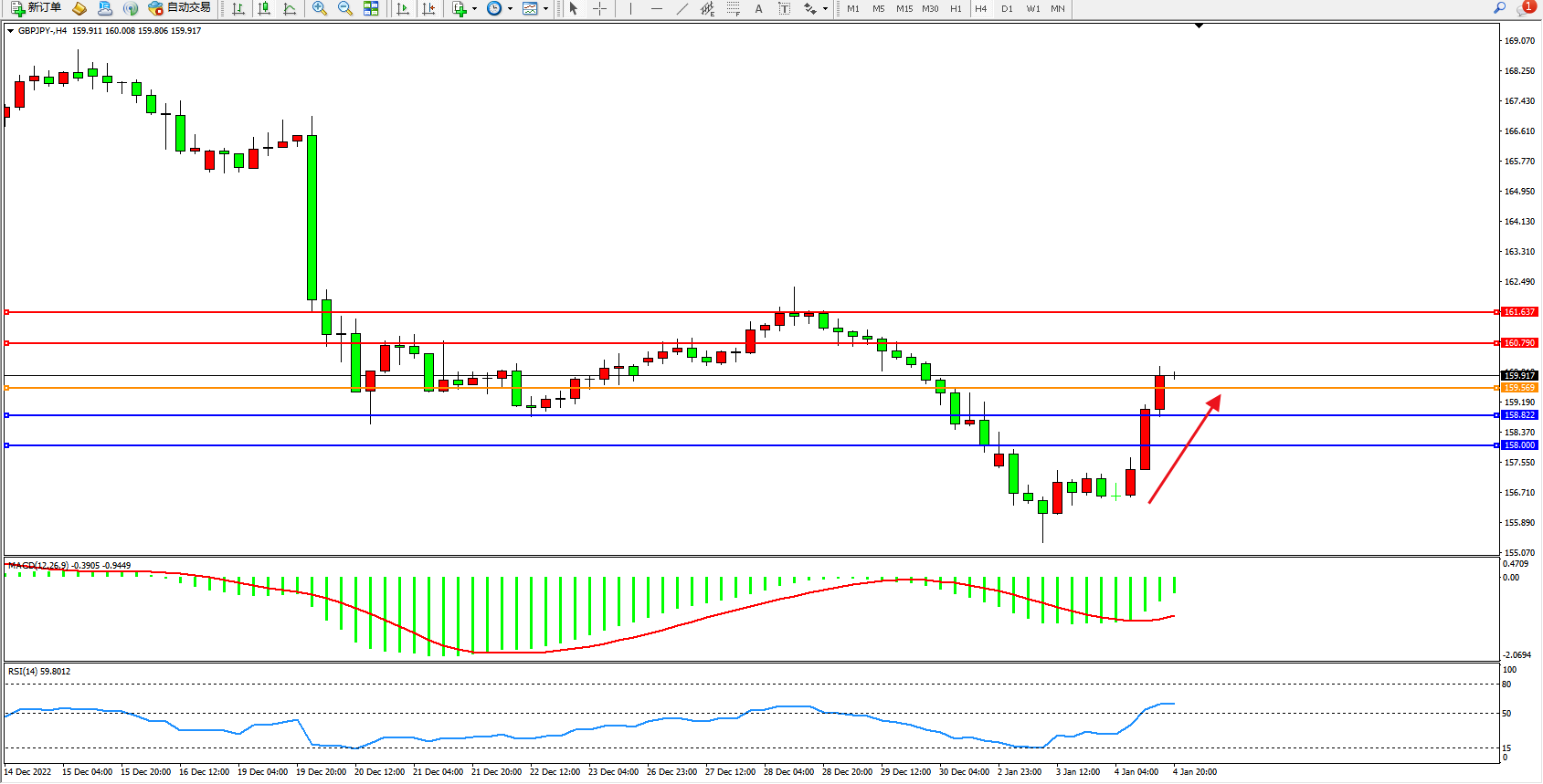 交易策略:159.569上方看涨,目标160.790、161.637