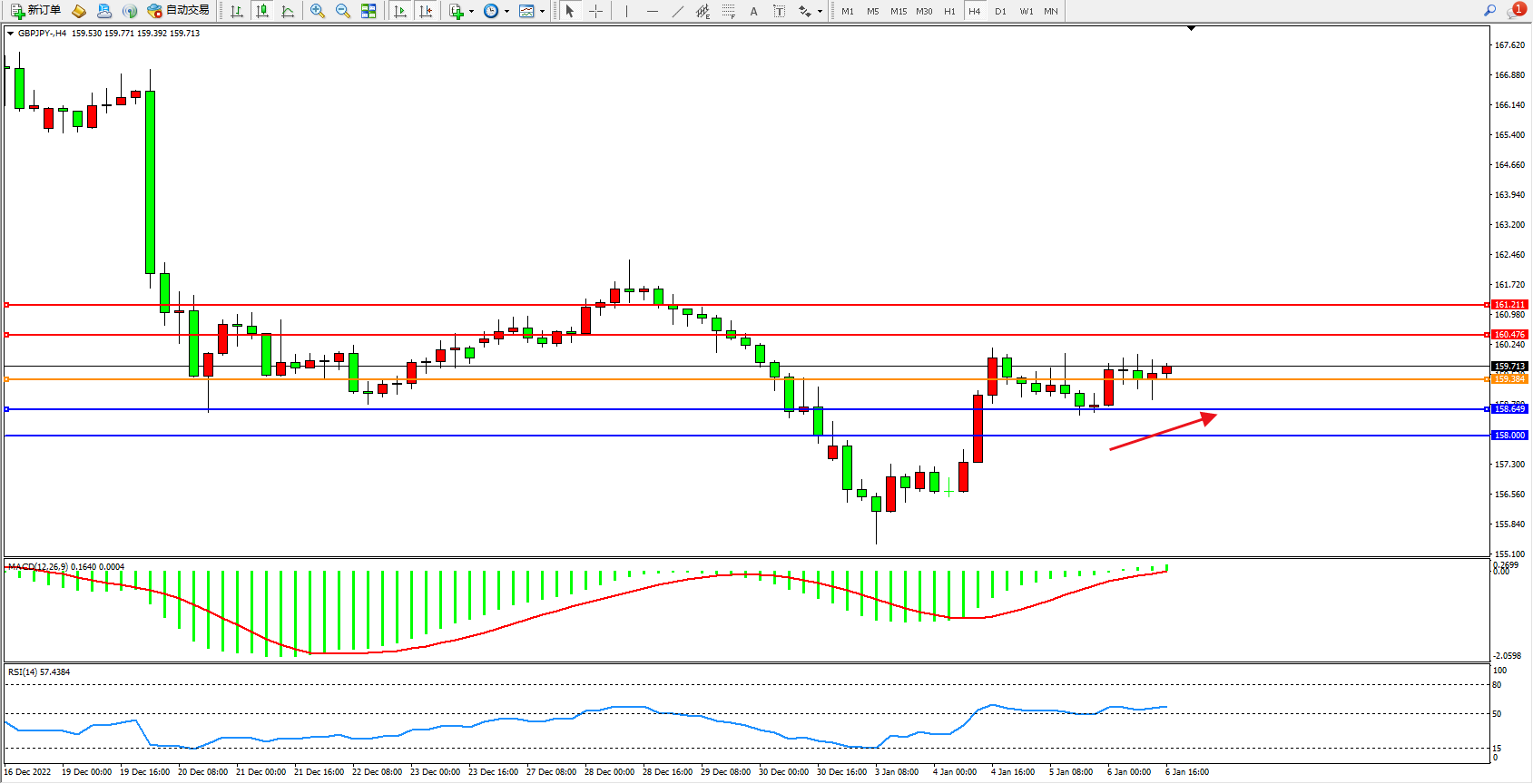 交易策略:159.384上方看涨,目标160.476、161.211
