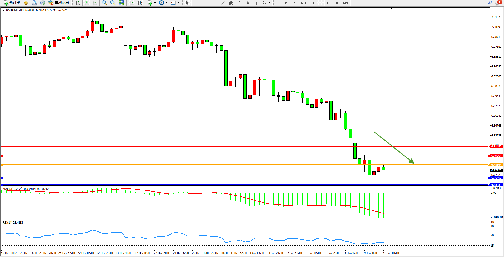 美元人民币USDCNH——4小时K线图显示: