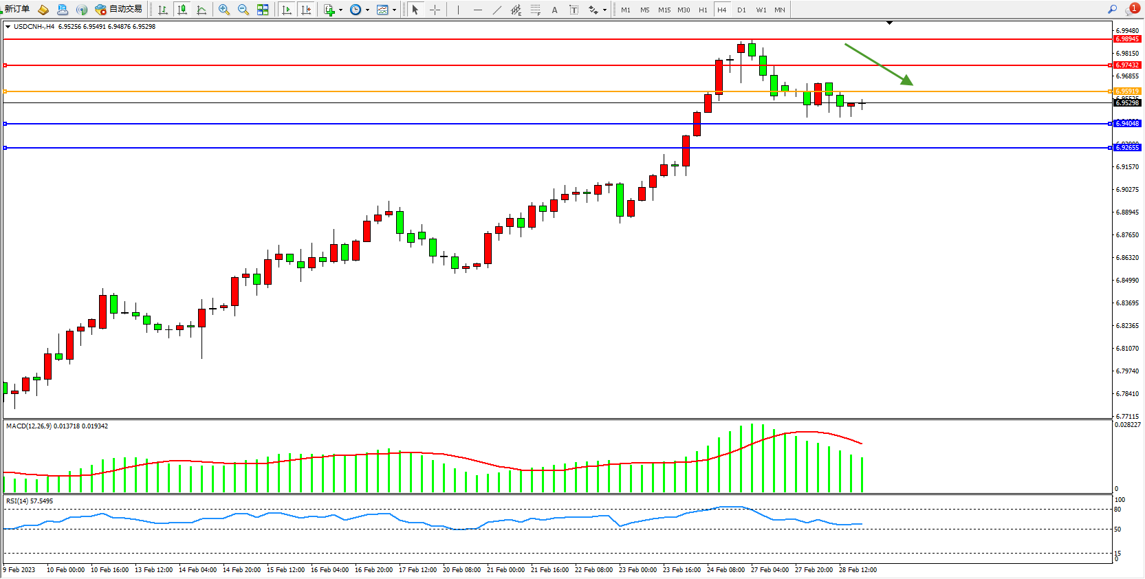 美元人民币USDCNH——4小时K线图显示: