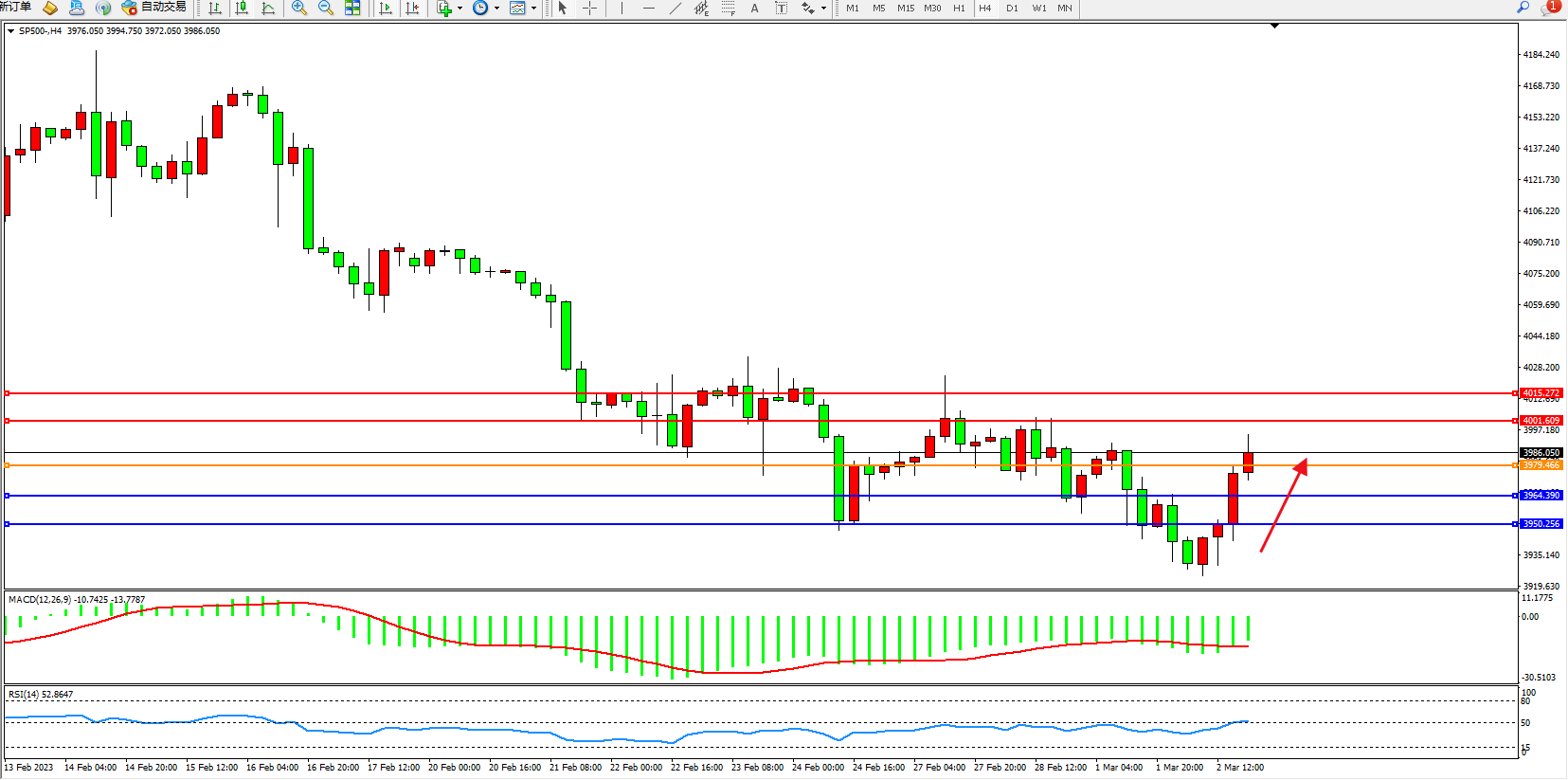 标普SP500——4小时K线图显示: