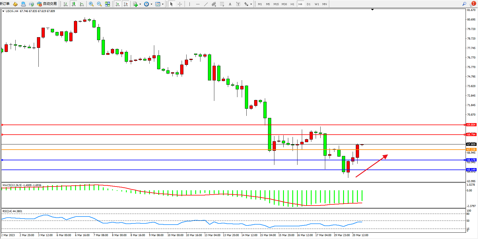 交易策略:67.228上方看涨,目标68.794 69.804