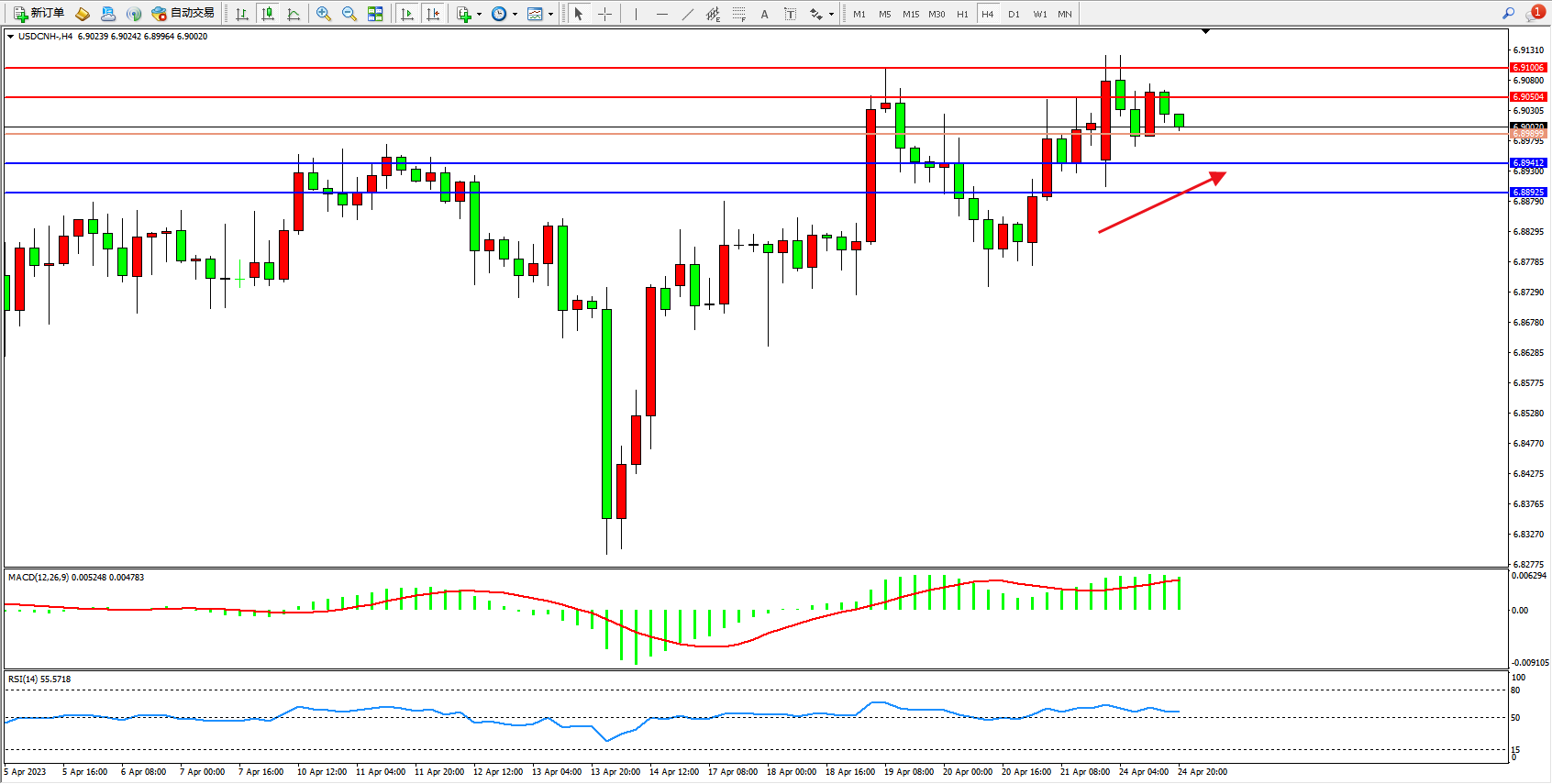 交易策略:6.89899上方看涨,目标6.90504  6.91006