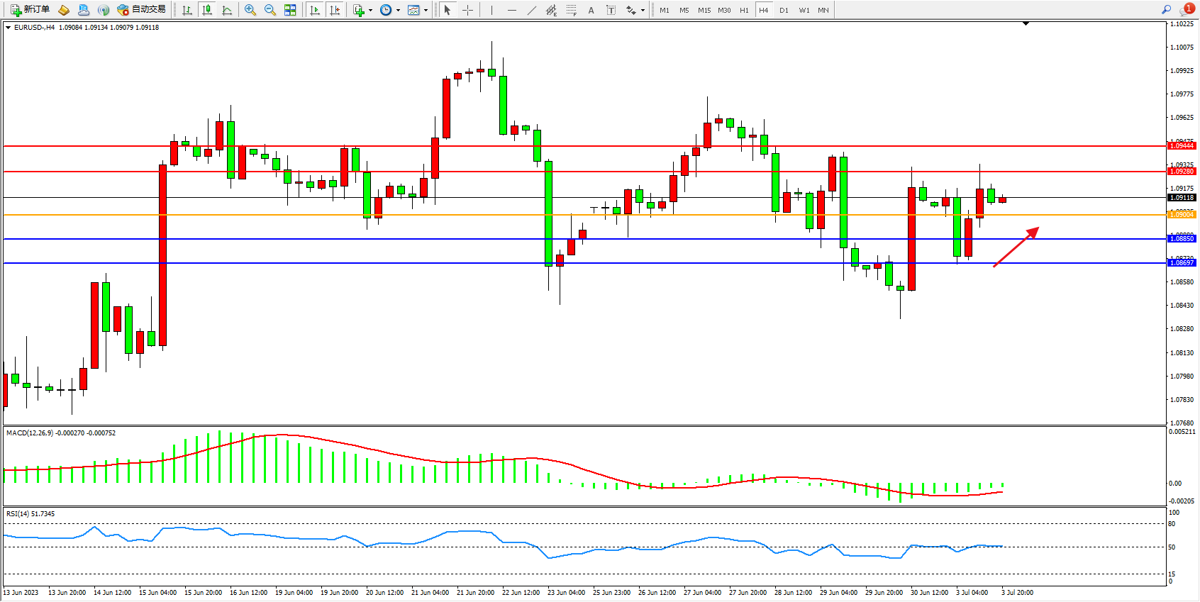 交易策略:1.09004上方看涨,目标1.09280  1.09444
