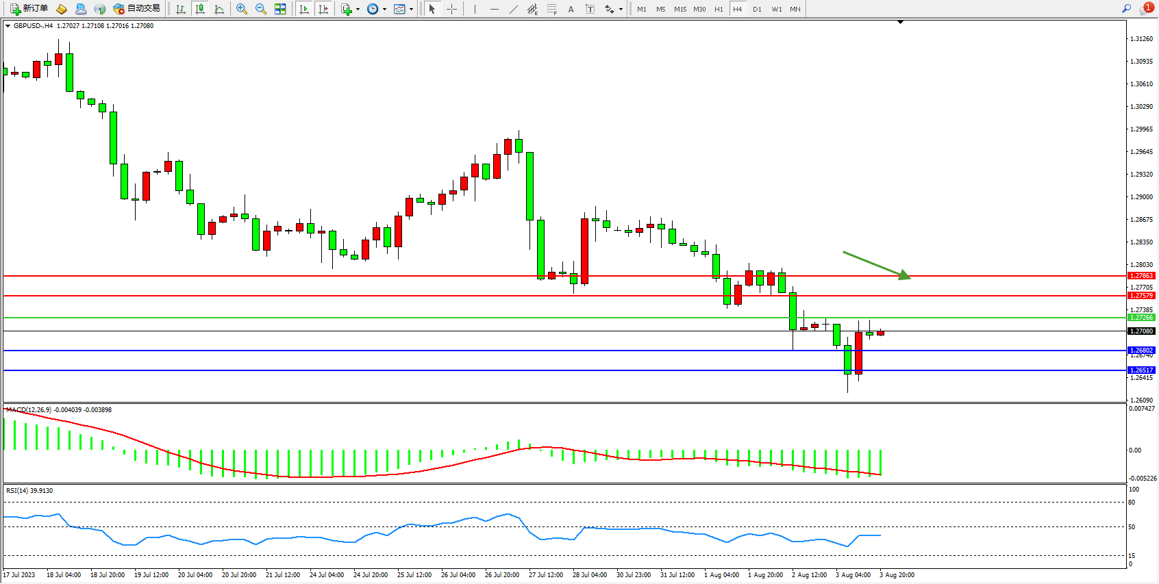 交易策略:1.27266下方看跌,目标1.26802 1.26517