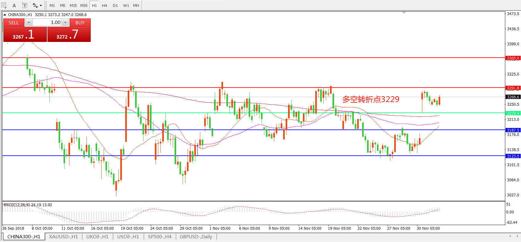 1小时图看,CHINA300中华指数跳空高开后站稳3229一线震荡,但整体位于多空转折点之上,长期均线逐渐走平,短期21周期均线有拐头迹象,日内依然以箱体震荡为主。