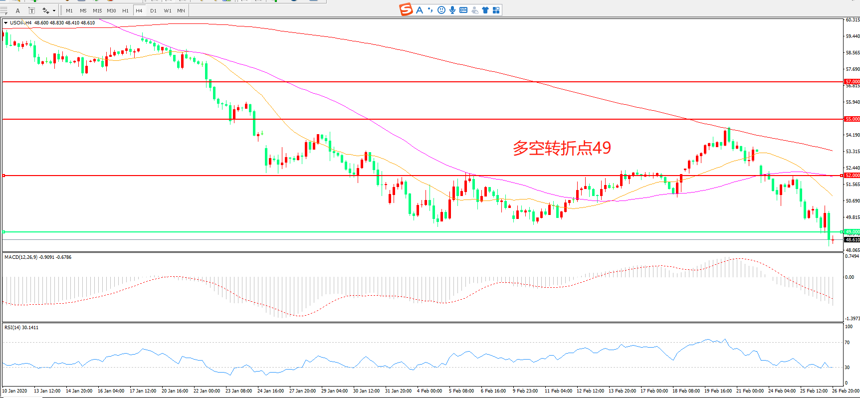 4小时图看,美油触碰49美金一线一度出现反弹,随后长阴下破,整体走势偏空,短期均线拐头向下,MACD绿柱增加,RSI指标走平,日内延续下行概率较大。