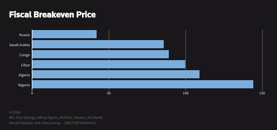 海湾合作委员会(GCC)的小伙伴还是认沙特这个老大的,但是非洲的欧佩克成员国兄弟就只能苦加哭。路透的报道显示,俄罗斯目前的财政预算平衡油价40+,沙特的在80+,像利比亚、阿尔及利亚、尼日利亚都在100以上的水平!沙特的现金流成本最低,10美元不到;俄罗斯的也不高,15美元不到;其他非洲兄弟的要15-30美元/桶。像尼日利亚最近的原油都Brent现货价格减贴水,而Brent现货(DTD Brent)也就20出头,所以尼日利亚的原油几乎就赔本边缘了。加蓬、赤道几内亚的原油现货卖得就完全是赔钱了。而对于像加蓬、尼日利亚这样的国家,这次呼吁欧佩克讨论市场,几乎就没一丝的影响力,被沙特无情的回绝了。一位尼日利亚的石油业内人士告诉路透记者,能做的就是问问而已,毫无能力。面对低油价和疫情,对于依赖石油收入的非洲产油国而言,今年是个异常痛苦的年份!对于沙特而言,毫不留情的价格战需要换取的如果仅仅是市场份额,那将是彻头彻尾的失败!不过沙特仍然再疯狂中,最近的豪言是要在5月份出口原油1060万桶/日。