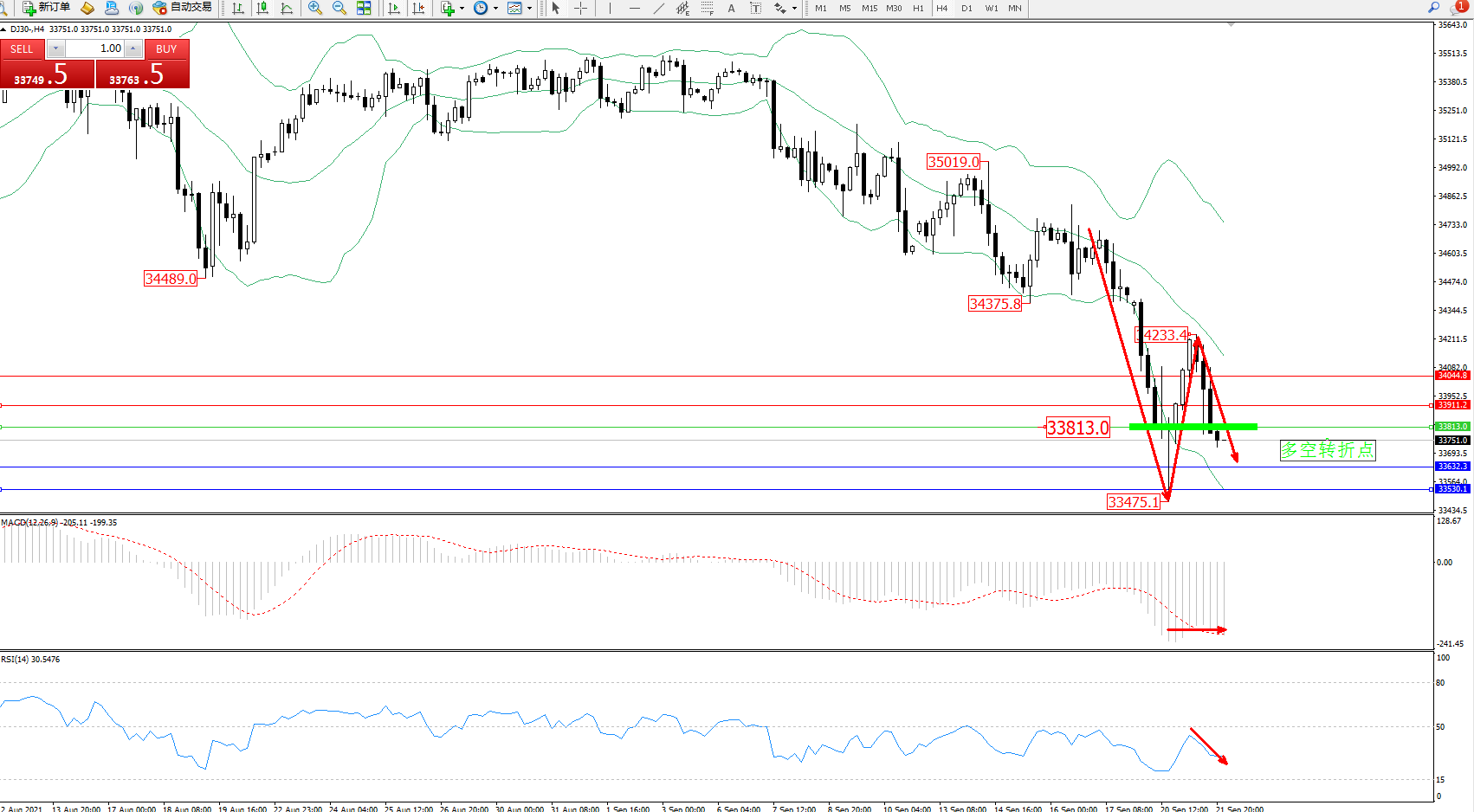 道琼斯指数DJ30——4小时K线图显示: