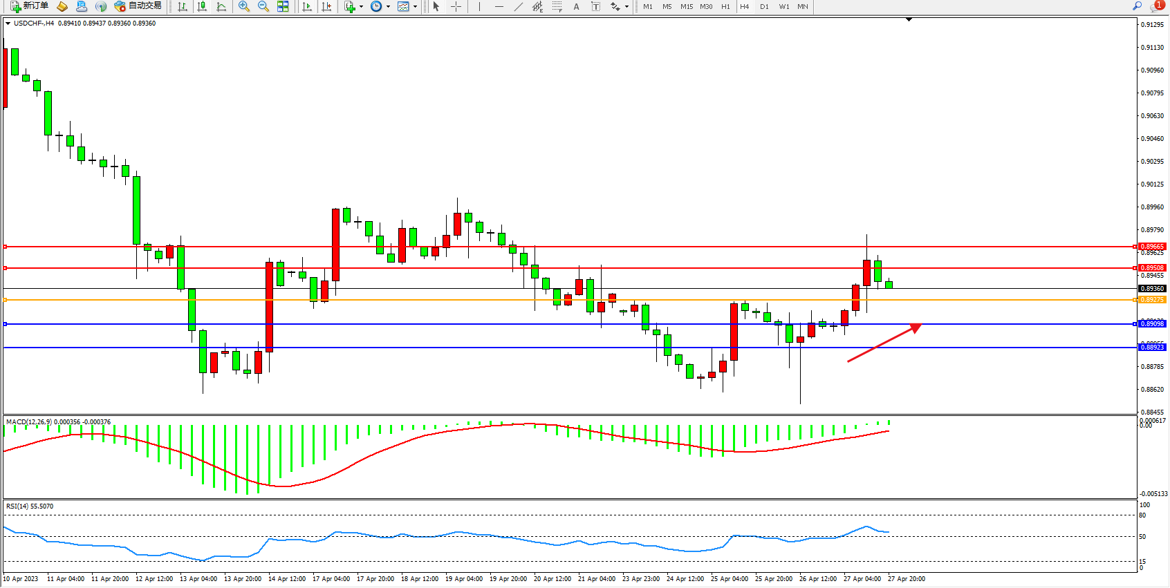 美元瑞郎USDCHF——4小时K线图显示: